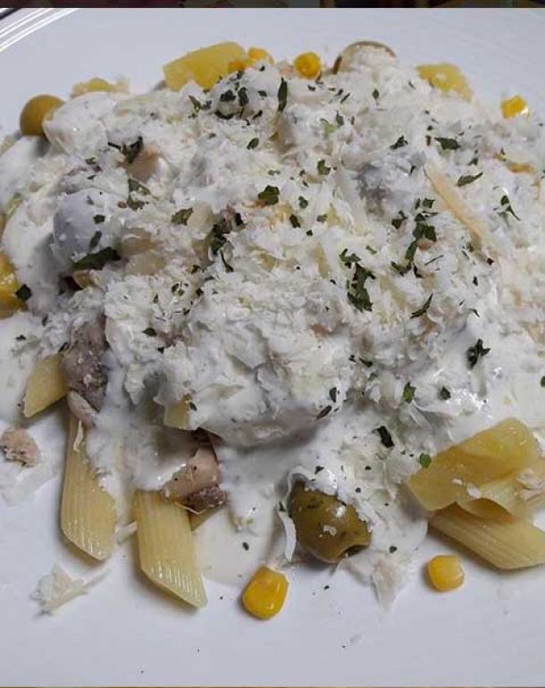 Pequeña / Grande11,90 / 15,70 €Piña, maíz, pollo, parmigiano reggiano y aceitunas verdes en salsa blanca.