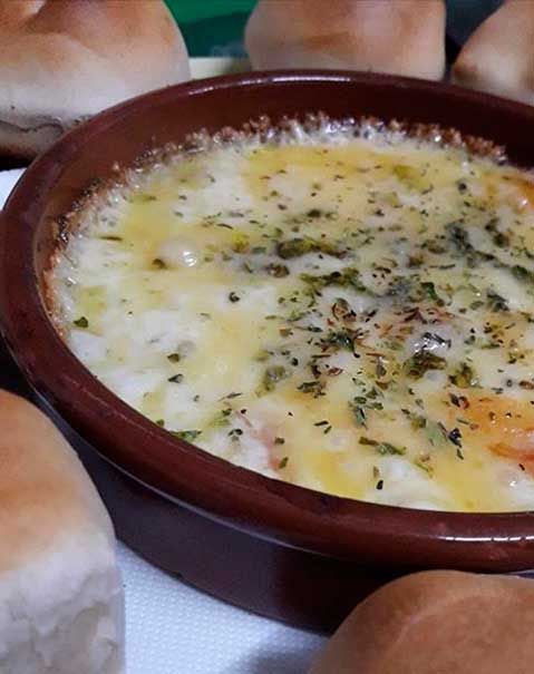 Con langostinos, salmón, cangrejo en una crema de quesos.