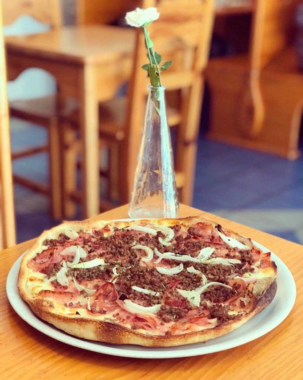 Pizza cerrada con crema de quesos, jamón, cebolla y queso de cabra 100%.