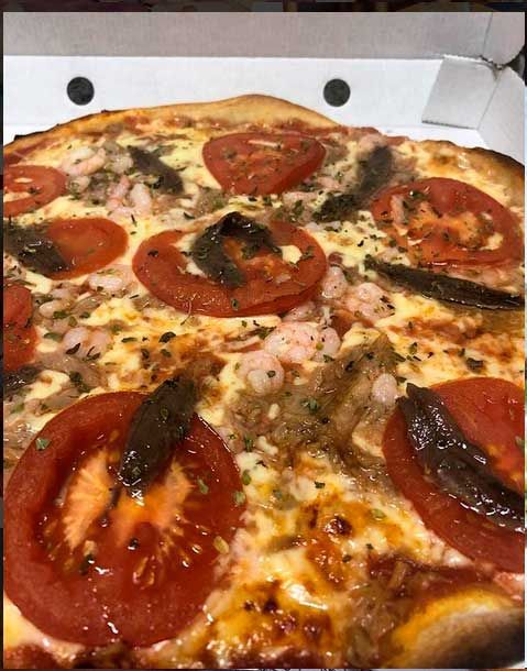 Tomate, queso, gambas, atún, anchoas del cantábrico y tomate cherry.