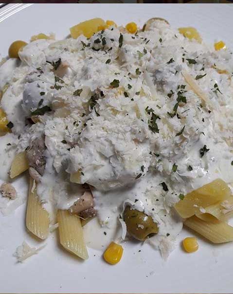 Pequeña / Grande11,00 / 14,00 €Piña, maíz, pollo, parmigiano y aceitunas verdes en salsa blanca.