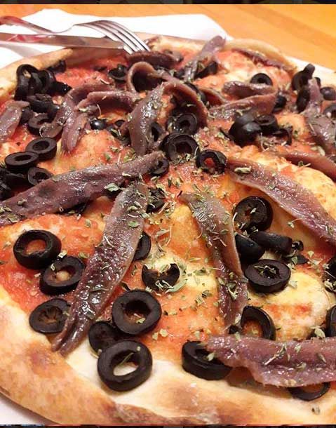 Tomate, queso, jamón, champiñón, alcachofa y aceitunas negras