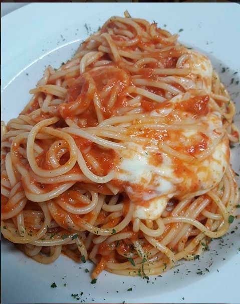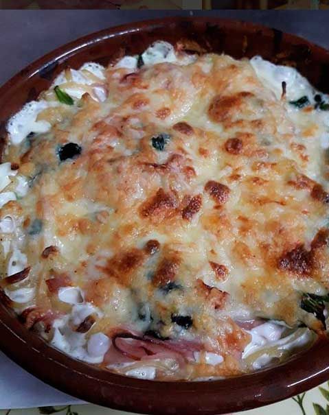Pasta rellena de carne en salsa boloñesa, jamón y queso gratinado.