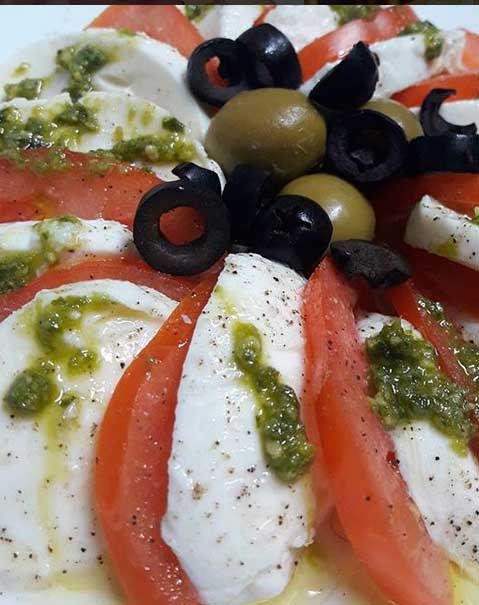 Tomate natural, mozzarrella, jamón serrano y pesto.